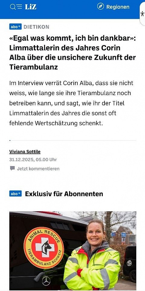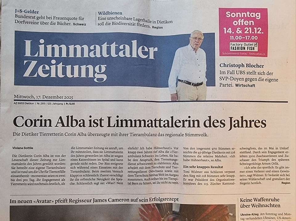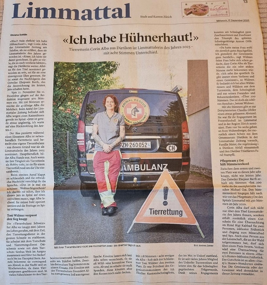 Eine besondere Ehre erhielten wir vom Limmattal, dessen BewohnerInnen die Gründerin der Tierambulanz Schweiz als "Limmattalerin des Jahres" gewählt haben.